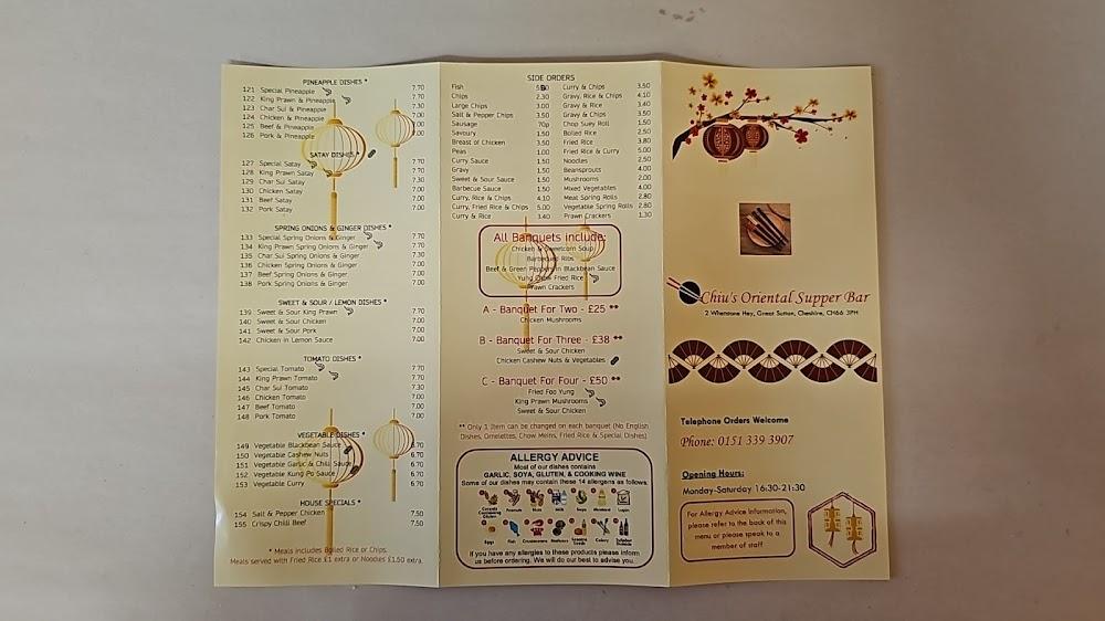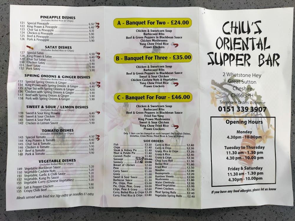 Located at 2 Whetstone Hey in Great Sutton, Ellesmere Port, Chiu's Oriental Supper Bar shines as a local favorite known for its Chinese takeaway and English dishes. This establishment's combination of quick service, tasty food, and a casual atmosphere draws in a diverse crowd. Visitors appreciate the restaurant's accessibility features, including a wheelchair-accessible car park and entrance, ensuring that everyone can enjoy a meal without hassle.
